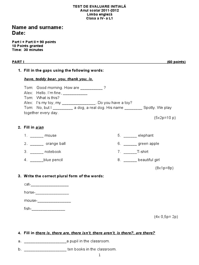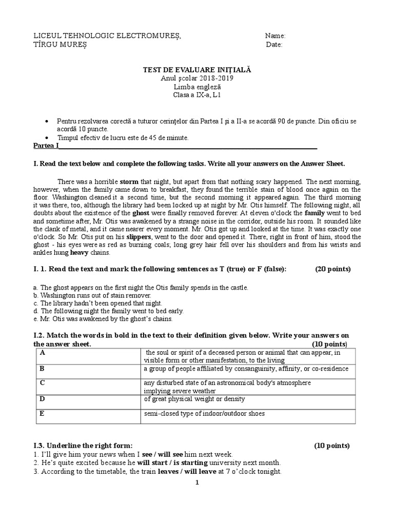 Test Initial, Clasa a 9-A, L1, Engleza (45 Min) +Barem - [DOC Document]
