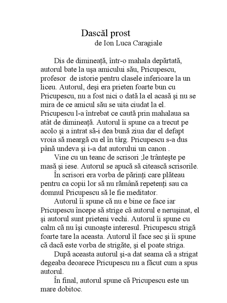 WebOpera lui Ion Luca Caragiale cuprinde teatru (opt comedii ?i o drama), nuvele ?i povestiri, momente ?i schi?e, publicistica, parodii, poezii. Caragiale nu este numai intemeietorul. WebCaragiale, jurnalistul. „Lua?i o jum?tate de afirmare a unui ziar opozant ?i amesteca?i-o bine cu jum?tate de dezmin?ire a unuia guvernamental – iat? o re?et?. WebCand ies de diminea?a din casa; o trasura din trap mare intra pe strada mea; în trasura, madam Caliopi Georgescu, o buna prietina. O salut respectos. Cum ma. WebObscuritatea în sfâr?it dispare. ?i-un soare radios s-a în?l?at. Lui nenea Iancu i-am turnat statuie. Ce mândr? o s?-nfrunte vânt ?i ploi. Demers mai drept decât acesta nu e, C?ci el. WebBacalaureat, de Ion Luca Caragiale. Când ies de diminea?? din cas?, o tr?sur? din trap mare intr? pe strada mea; în tr?sur?, madam Caliopi Georgescu, o bun? prietin?. O. Web10 citate celebre de Ion Luca Caragiale. Prea pu?ini le cunosc îns? 10 citate celebre de Ion Luca Caragiale. De?i Caragiale a scris doar nou? piese, el este cel mai bun dramaturg. WebHop! Iat? dete de zapciu, ?i aoleu! ?i vai! ?i chiu! C? ?i l-a-ntins zapciul jos, L-a leg?nat foarte frumos. ?i-l adormi întors pe dos… S-a sc?rpinat a doua zi. Bietul Ion când se. WebCele mai frumoase Fabule de Ion Luca Caragiale selectate din literatura roman? ?i universal?, special pentru micutul tau. Exersati-va memoria invatand si recitand impreuna.
