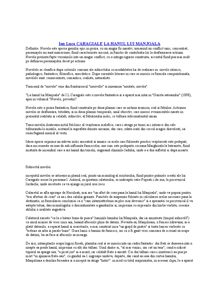 WebLa Hanul Lui Manjoala Rezumat. Limba român? Temelescolii October 15, 2021 0. 197 dintre utilizatori au c?utat acest r?spuns la aceast? tem? luna trecut? ?i 167 o. WebLa hanul lui Manjoala de I. L. Caragiale rezumat comentariu literar ?i nuvela de citit online - Literatura romana comentarii fi?? de lectura rezumat eseu c?r?i de. WebRezumatul nuvelei „La hanul lui Manjoala”, de I. L. Caragiale. – in drum spre viitoarea sa nevasta, Fanica se opreste la un han renumit, cunoscut si drept „Hanul. WebMomentele subiectului in nuvela La hanul lui Manjoala. Tema nuvelei ilustreaz mitul folcloric al vrjitoarei malefice, care-i intoarce din cale tulburndu-le minile, scoand la suprafa dorine.