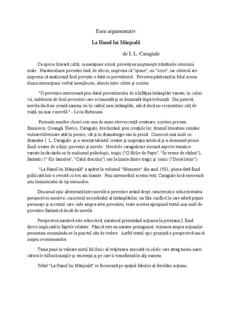 Eseu argumentativ pentru La Hanul lui Manjoala