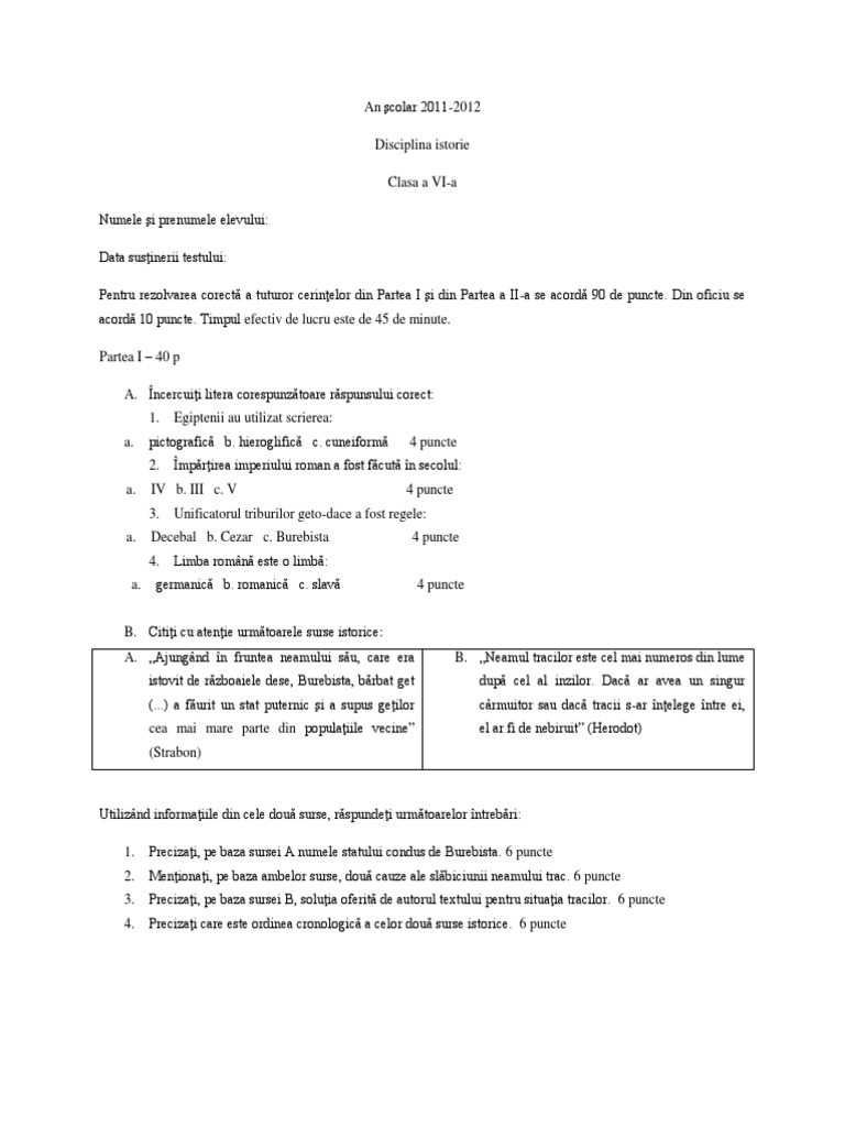 Test Evaluare Initiala clasa a VI-a la istorie