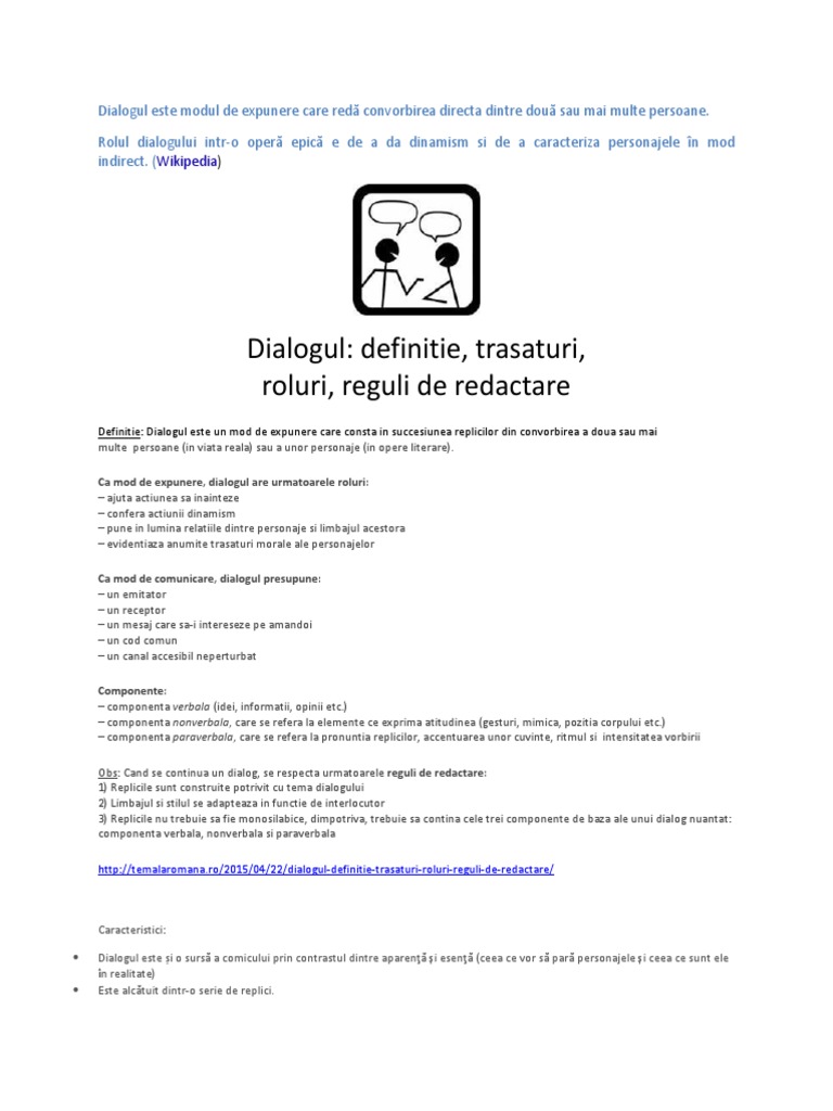 WebDialogul se caracterizeaza prin prezenta liniei de dialog la inceputul fiecarei replici, prin folosirea constructiilor exclamative si interogative, a vocativelor si. WebModurile de expunere reprezint? modalit??ile pe care scriitorul le utilizeaz? în operele literare pentru a reda întâmpl?ri, fapte, personaje, fenomene etc.. Acestea sunt:.