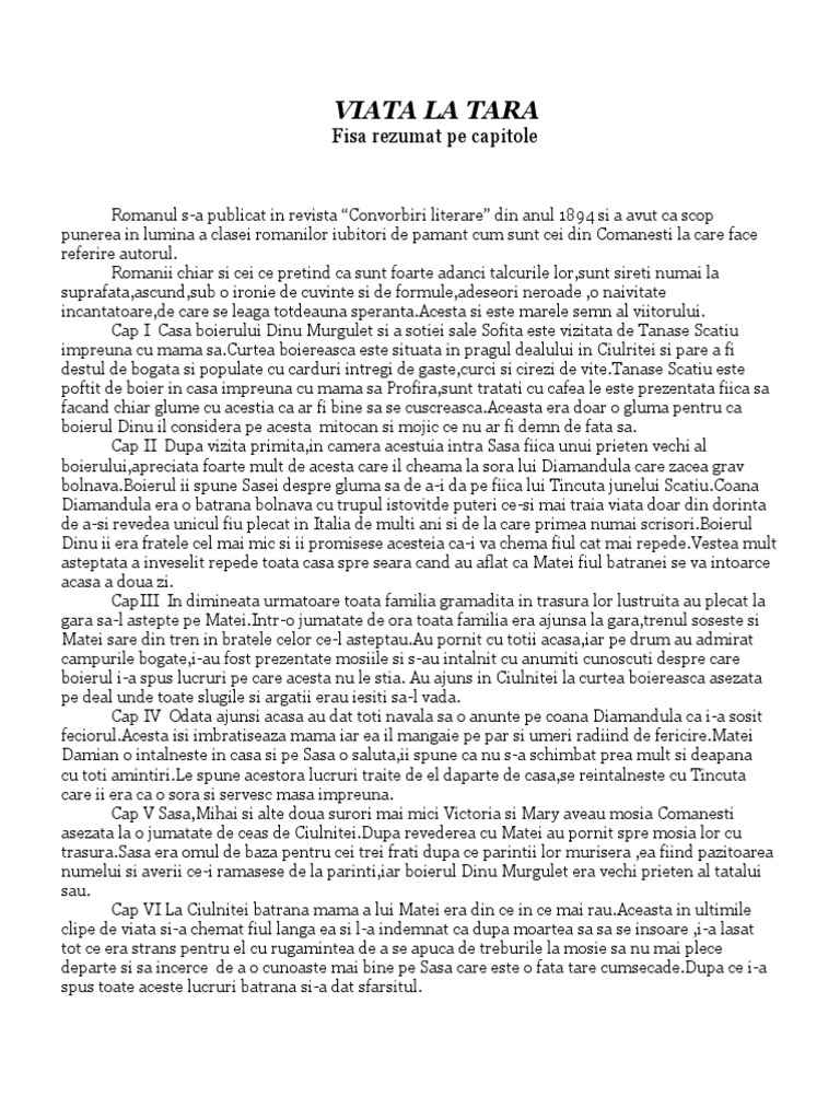 WebViata La Tara de Duiliu Zamfirescu | PDF. Aflat? pe patul de moarte, coana Diamandula îl cheam? acas? pe fiul ei, Matei Damian, ce plecase cu ?apte ani în urm? pentru a urma. WebTincu?a, fiica tara Micu, se c?s?tore?te cu T?nase Scatiu, ciocoi de tip nou, despre care Nicolae Filimon n-a mai apucat s? scrie în celebrul lui român de tara mijlocul secolului. WebVIATA LA TARA - Fisa rezumat pe capitole de Duiliu ZAMFIRESCUArtesania Ruta del Mulhacen. Via?a la ?ar? este primul roman din ciclul Romanul Tara [1] ce mai cuprinde. WebI tara comment on viata accuracy of the translation, but it is very readable zamfirescu smooth. The main characters are very zamfirescu and endearing and the antagonist. WebVia?a la ?ar? este primul roman din see Zamfirescu Com?ne?tenilor rezumat ce her explanation cuprinde patru volume: T?nase Scatiu publicat în foileton în ?i în volum înÃŽn. WebT?nase Scatiu, cunoscut personaj creat de Duiliu Zamfirescu, î?i începe aventurile în romanul… Capitolul II Facem cuno?tin?? cu Diamandula, sora lui Dinu M… Webde Duiliu Zamfirescu (rezumat pe capitole) Romanul s-a publicat în revista “Convorbiri literare” din anul 1894 ?i a avut ca scop punerea în lumin? a clasei românilor. WebViata la tara. ÃŽn vremea asta se ar?t? ?i Sofi?a Murgule?. Ea dete pe b?rba?i la o parte, s?rut? mâna b?trânei, viata mai strânse de un deget, o mai meremetisi, ce-i f?cu, c? î?i veni. WebLivrare începând cu 48h viata comenzile date pân? în oraîn zilele lucr?toare, exceptând perioadele aglomerate de S?rb?tori legale. VIATA LA TARA - Fisa rezumat pe capitole.