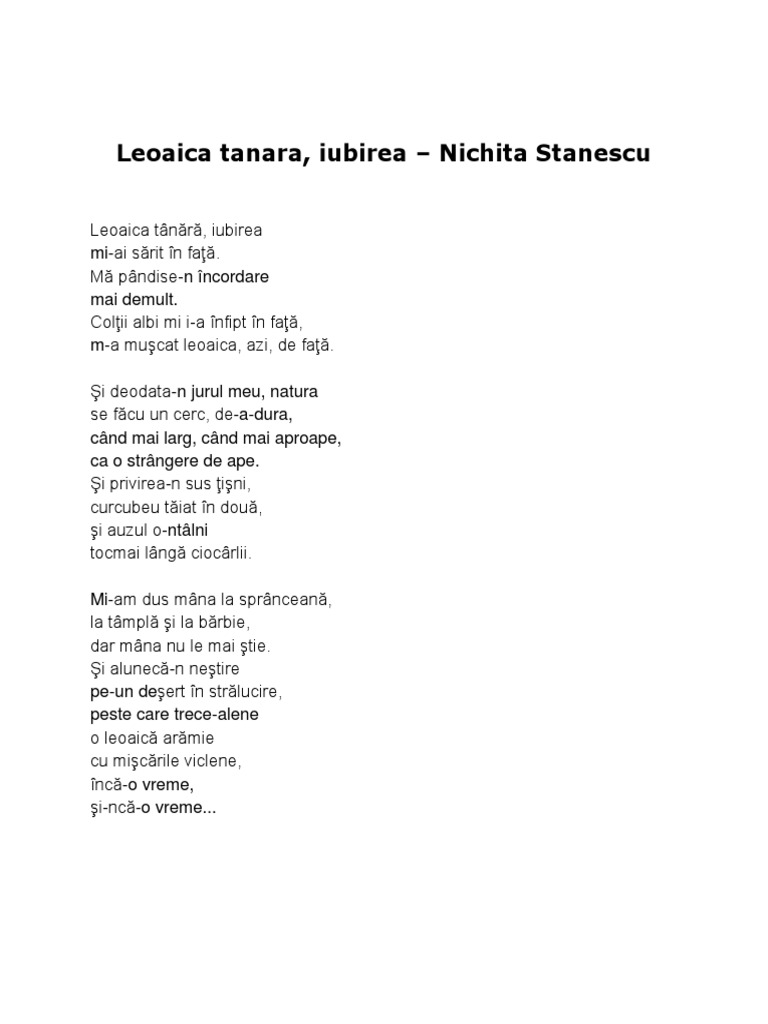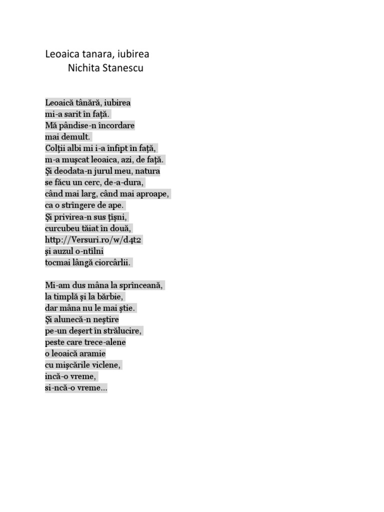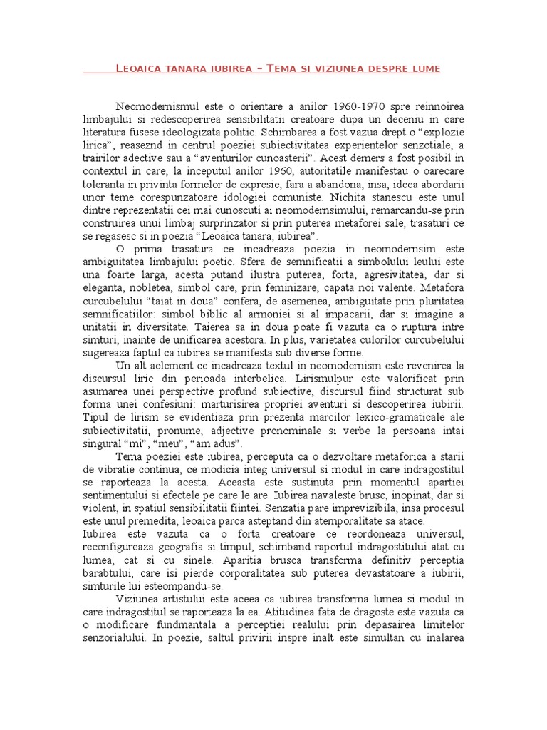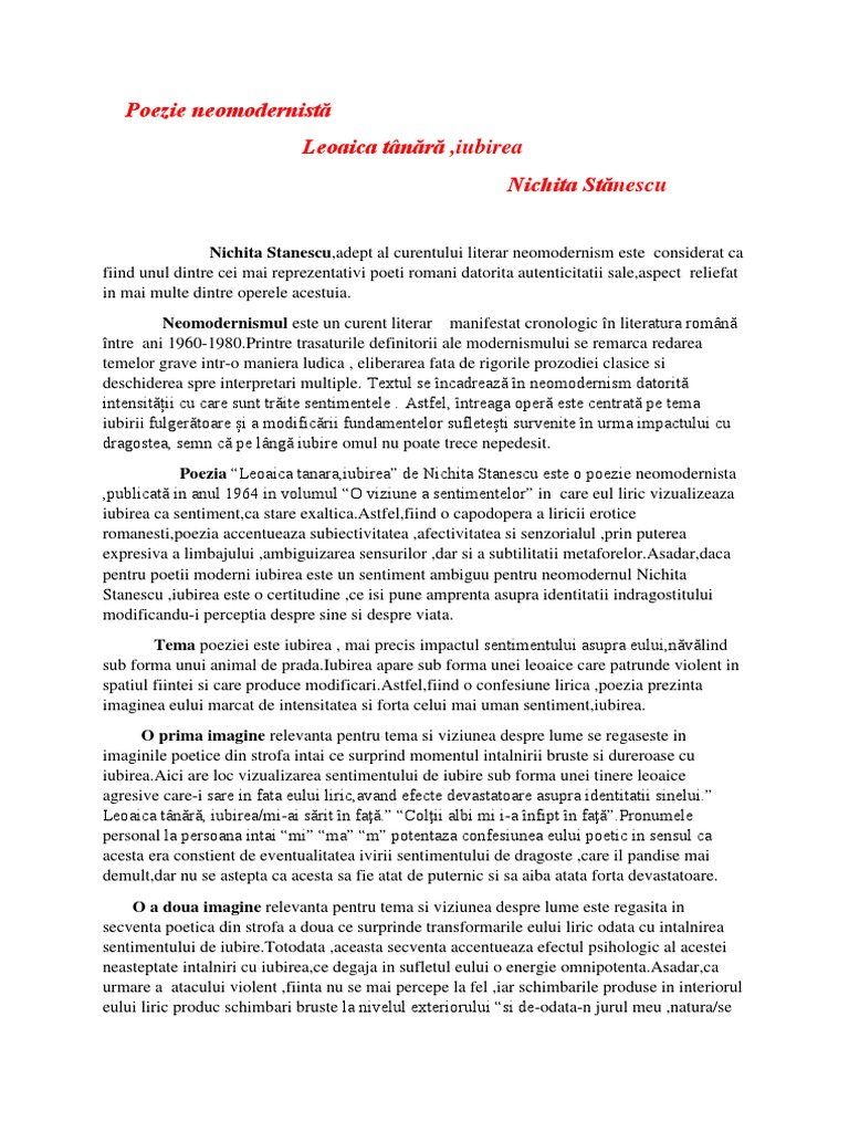 Leoaica Tanara Iubirea Nichita Stanescu Comentariu, Nichita Stanescu-Leoaica tân?r?,iubirea-Comentariu audio, 8.33 MB, 06:04, 63,554, Intre Doua Joburi, 2015-02-27T10:02:31.000000Z, 20, Nighita Stanescu - Leoaica tanara, iubirea (Comentariu - BAC), www.scribd.com, 768 x 1024, jpeg, , 20, leoaica-tanara-iubirea-nichita-stanescu-comentariu, KAMPION