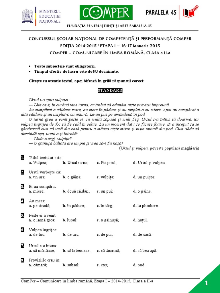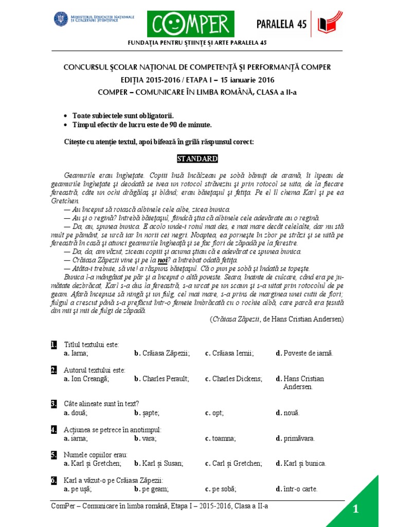 WebSUBIECTE ROMÂN? COMPER 2017. Etapa a II-a a concursului Comper 2017 a început vineri, 31 martie, cu examenul la Limba Romana, iar pe 7 aprilie urmeaza. WebDat fiind faptul c? în noile preciz?ri în vigoare ale Gramaticii Academiei, din 2021, „dânsul, dânsa/dân?ii, dânsele” sunt considerate forme pronominale care exprim? un grad minim. WebComPer – Matematic?, Etapa Na?ional? – 2016-2017, Clasa a III-a Itemii 1-16 se noteaz? cu câte 5 puncte fiecare; itemii 17-18 se noteaz? cu câte 10 puncte fiecare. Total: 100 de.