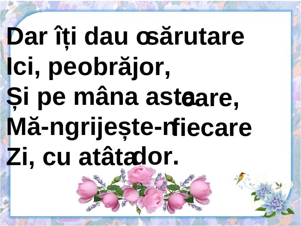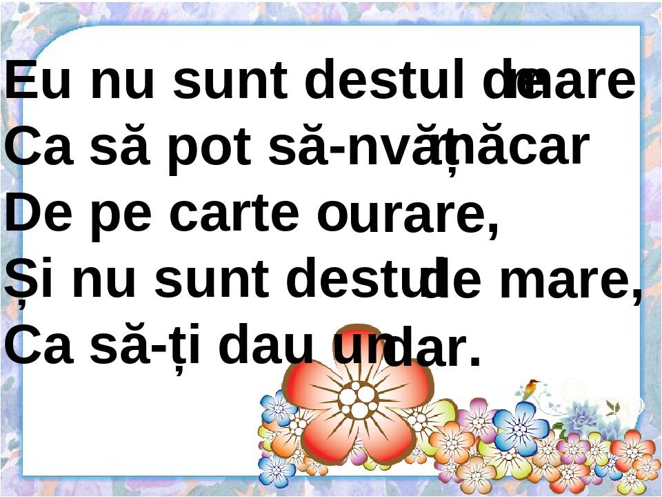 WebElena Farago, De ziua mamei: Eu nu sunt destul de mare / Ca s? pot s?-nv?? m?car, / De pe carte, o urare, / ?i nu sunt destul de mare. Sari la con?inut. Caut? .. WebDe ziua mamei - Elena Farago. Ad?ugat de: Gerra Orivera. Eu nu sunt destul de mare. Ca s? pot s?-nv?? m?car, De pe carte, o urare, ?i nu sunt destul de mare. Ca s?-?i dau un. WebCa s?-?i dau un dar. Dar î?i dau o s?rutare, Ici, pe obr?jor, ?i pe mana asta care. M?-ngrijeste-n fiecare. Zi, cu-atata dor! Zile lungi ?i voie bun?. Îti doresc eu mult, ?i ma rog. WebDe ziua mamei, de Elena FaragoPovesti si poezii pentru copii WebDar î?i dau o s?rutare, Ici, pe obr?jor, ?i pe mâna asta care. M?-ngrije?te-n fiecare. Zi, cu-atâta dor! Zile lungi ?i voie bun?. Î?i doresc eu mult, ?i m? rog de flori s?-?i spun?. S? m?. WebBun? ziua! Eu sunt Pi?co?el! Bine ai venit pe canalul meu!Poezia "De ziua mamei" de Elena Farago #8martie #ziuamamei #povestileluiPiscotel Dac? dori?i s? v? ... WebElena Farago (Elena Paximade) De ziua mamei versuri: Eu nu sunt destul de mare / Ca s? pot s?-nv?? m?car, / De pe carte, o ur... Deutsch English Español Français Hungarian. WebCATEGORII: Poezii de primavara. Ca sa pot sa-nvat macar, De pe carte, de ziua mamei elena farago de ziua mamei poezie Eu nu sunt destul de mare, o urare. Vizualizari:. WebCele mai frumoase poezii dedicate mamei. Poezii de Mihai Eminescu. Poezii de Lucian Blaga. Poezii de Octavian Goga. Poezii de Vasile Alecsandri. Poezii de Tudor.
