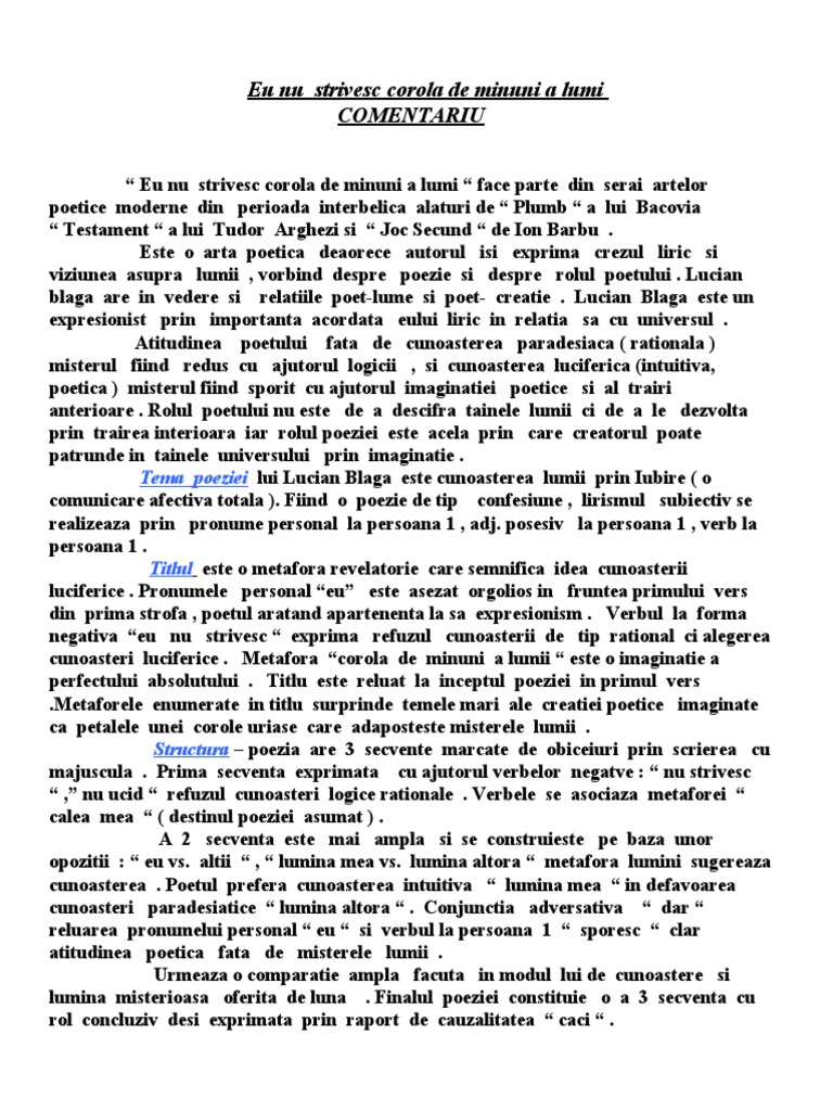 WebEu nu strivesc corola de minuni a lumii – de Lucian Blaga > Comentariu literar Poezia „ Eu nu strivesc corola de minuni a lumii ” este o art? poetic? modernist?, care face. WebCONCLUZIE Eu nu strivesc corola de minuni a lumii de Lucian Blaga este o art? poetic? modern? deoarce se pune problema rela?iei dintre poet ?i lume ?i, mai. WebRead Eu nu strivesc corola de minuni a lumii ~comentariu~ from the story Comentarii BAC 2022 ?i Referate by Georgiana_Author (?????????????????? ???????????)...