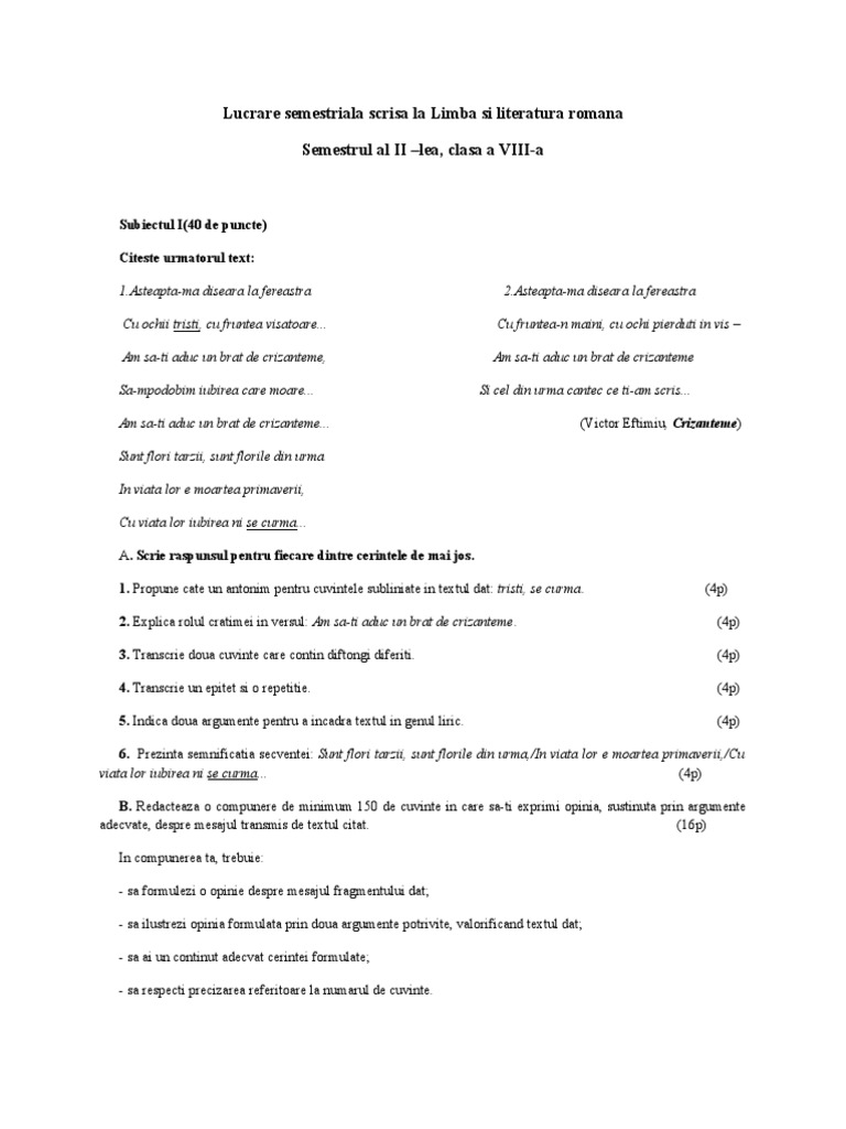 Lucrare Semestriala Scrisa La Limba Si Literatura Romana