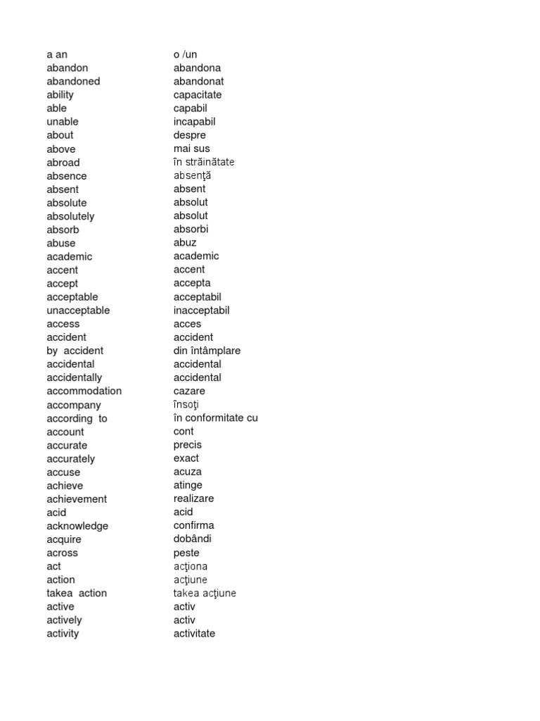 WebCand vine vorba de pronuntia literelor din alfabetul in engleza si a cuvintelor, este mult mai important sa inveti forma perfecta incet decat sa treci rapid prin toate. WebExemplele au rolul de a te ajuta s? traduci cuvinte sau expresii corect si adaptat la context. Nu sunt selectate sau validate manual, a?adar pot con?ine termeni inadecva?i. Te rug?m. WebSite-ul Inengleza.com gazduieste circa 30.000 de cuvinte in Limba Engleza, traduse in Limba Romana, si cuvinte in Limba Romana, traduse in Limba Engleza. Cuvintele sunt. Webmolusc? (cu carapace) shellfish mors? walrus/ sea-cow nisetru sturgeon musc? fly nev?stuic? ferret/ weasel nurc? mink omid? caterpillar urechelni?? earwig purice flea. WebCunosti Aceste 50 De Expresii Frecvente In Engleza. Cunosti Aceste 50 De Expresii Frecvente In Engleza is the future of business technology, and it is essential for. WebCele mai folosite 400 cuvinte în englez?, dup? frecven?a lor. Topul primelor 400 cuvinte din limba englez? sub form? de list? ca s? exersezi oricând vrei tu. Ai acces.